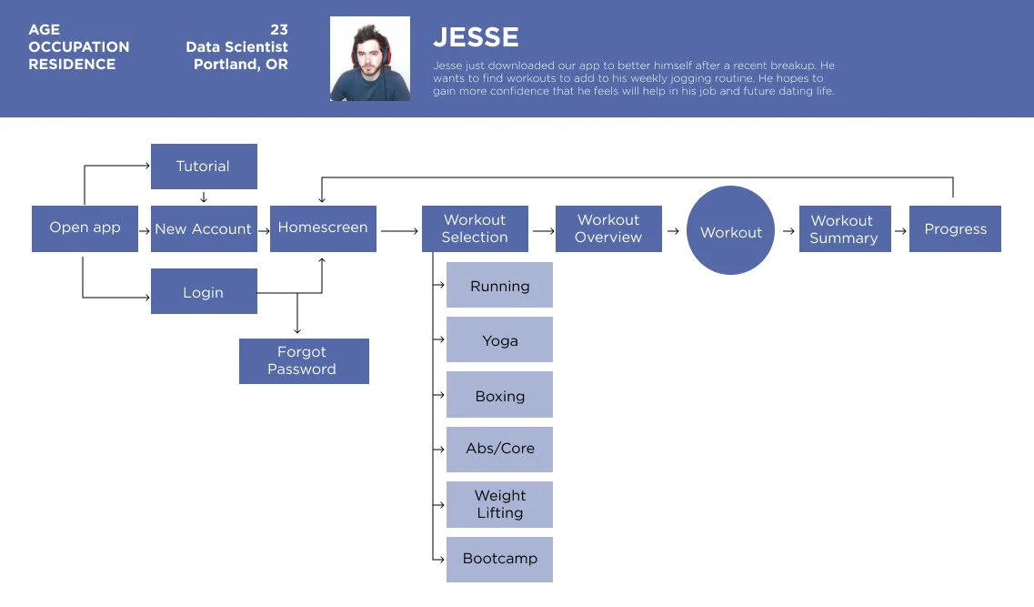 Site Map: I based my site map around concept of progression. I started to think of the value prop of rewarded workouts and progression. I had a rough idea of the layout based on this theory.